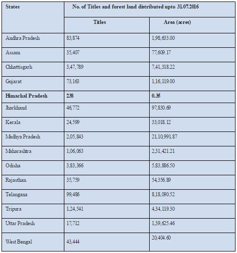 In the country many state governments have implemented this Act and issued both individual and community titles under FRA 2006. As per the information collected till 31st July, 2016, 41,82,806 claims (40,72,241 individual and 1,10,565 community claims) have been filed and 16,84,627 titles (16,40,160 individual and 44,467 community claims) have been distributed.