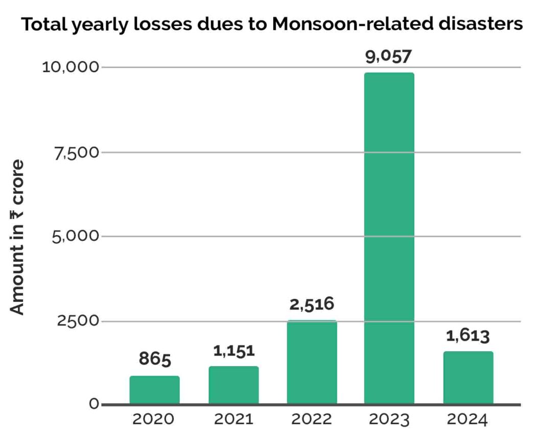 The monsoon of 2023 brought immense and unprecedented loss and damage to the mid-Himalayan region of Himachal, with over 5,000 hazard incidents recorded during spells of intense precipitation. Despite two years of lobbying the centre to release ₹9,000 crore, based on the Post-Disaster Needs Assessment (PDNA) conducted by the National Disaster Management Authority in 2023, the Ministry of Home Affairs released only ₹2,000 crore in June this year. The yearly losses shown in this graph are adding up to pose a serious challenge to state finances. (Data from HPSDMA Memoranda 2020–2024)