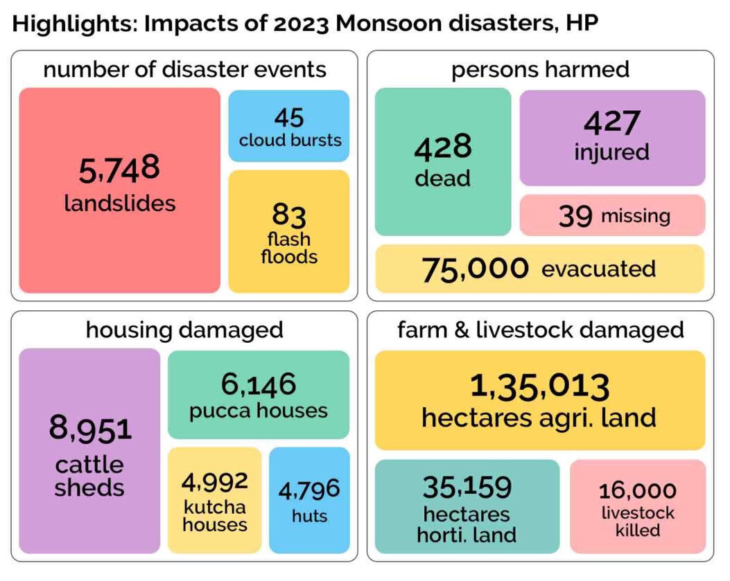 Earlier this year, after much pressure from the Kerala State Government, the 2024 Wayanad landslide disaster was declared a calamity of ‘severe’ nature, making it eligible for Central Government assistance. While the Wayanad calamity was massive in terms of the total number of casualties in a single incident (500 dead), Himachal Pradesh saw a series of extreme rainfall, landslide and flood events across multiple locations during July and August 2023, that cumulated in 428 deaths. But, as the adjacent image shows, the key data points of the overall impacts reveal a distressing bigger picture. (data from PDNA, 2023, and HPSDMA Memorandum, 2023)