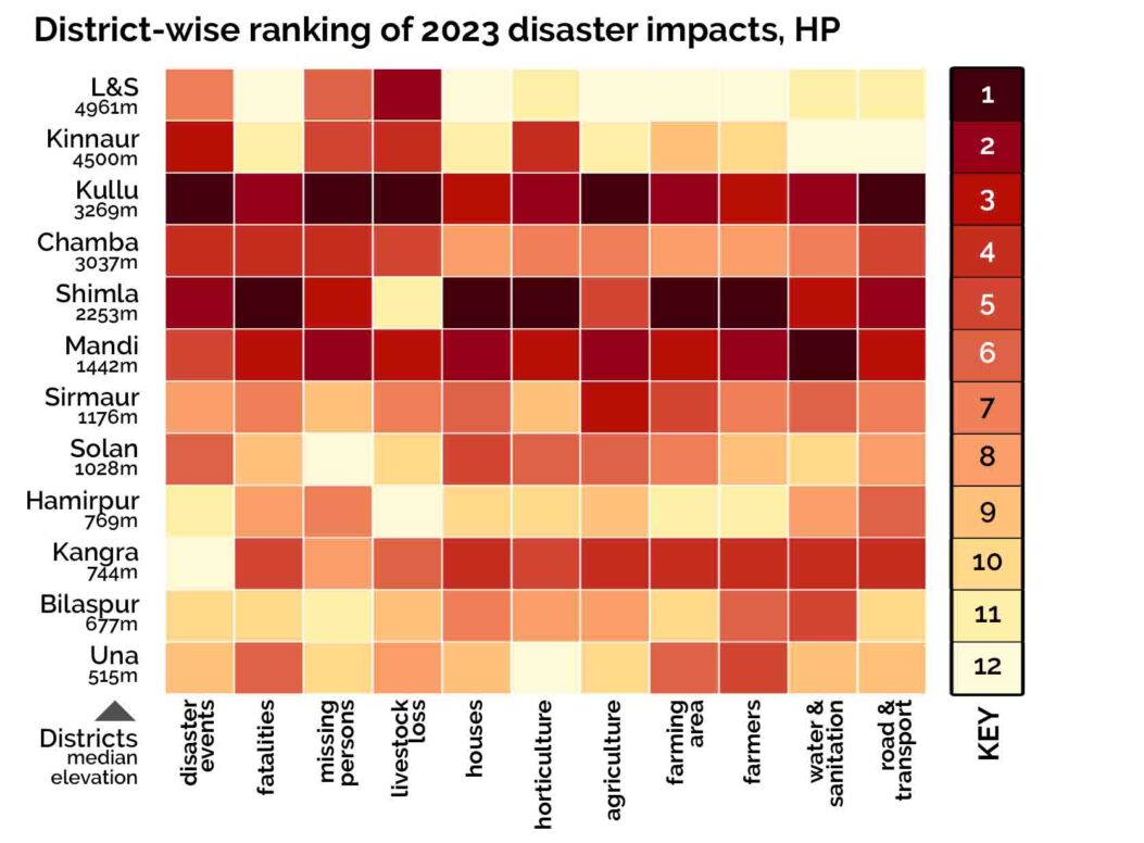 This heat map ranks HP districts based on the scale of impacts of the 2023 disasters, revealing that Kullu, Shimla and Mandi experienced the most severe losses, followed by Kangra, Chamba and Kinnaur. Kangra’s low-lying areas experienced heavy damage in floods, while the Trans-Himalayan district of Lahaul & Spiti went through 28 landslide incidents. In Shimla city, 20 people were killed in a single landslide incident on August 14, 2023. (Data from PDNA, 2023, Memorandum 2023 by HPSDMA, and Cumulative Report by Department of Revenue, HP)