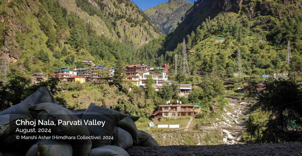 View of Chhoj Nala near Manikaran Village, showing commercial and hospitality buildings located on the edges of the Nala and the Parvati River.
