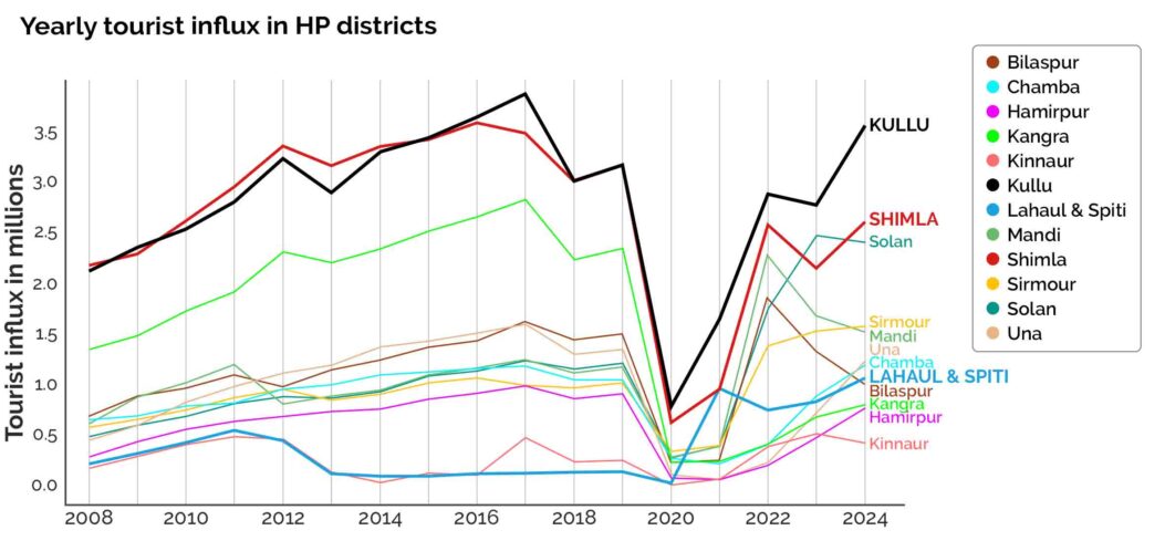 Tourism in Kullu Valley has surged dramatically over the decades—from 13,310 visitors in 1979–80 to over 67,000 in 1991–92, and further to 1.2 lakh by 1996. By 2024, the district recorded a staggering 35 lakh tourist arrivals, the highest in Himachal Pradesh, outpacing even Shimla and contributing significantly to the state’s total of 1.8 crore visitors. This surge has been especially prominent after the COVID-19 pandemic—causing the sharp dip in the year 2020—with Kullu overtaking Shimla as the winter tourism hub. The completion of the Atal Tunnel in 2020 also opened access to Lahaul and Spiti, catalysing steady tourist inflows there. Simultaneously, Solan experienced a rise in popularity, owing to its proximity to Punjab, Haryana, and the NCR.